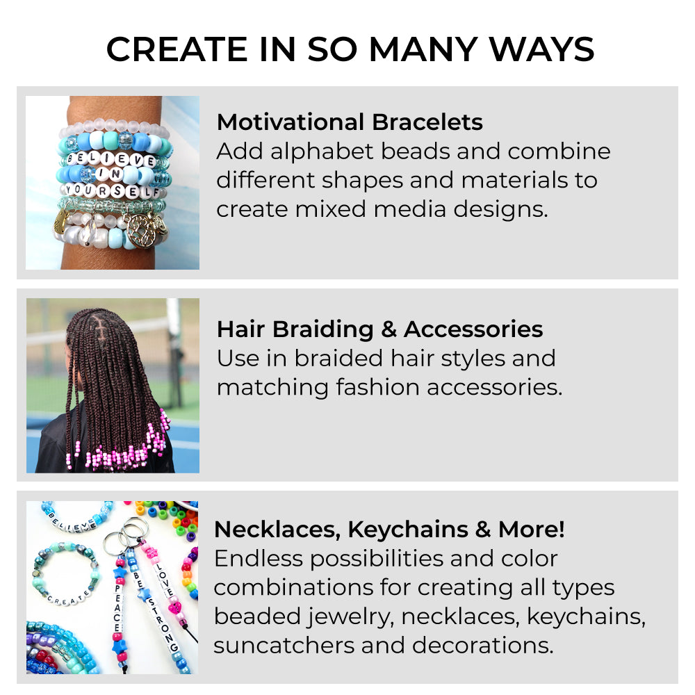 We offer alphabet beads, craft beads, jewelry beads and pony beads for your artsy and creative projects. Our beads are perfect for making stylish bracelets or create custom friendship bracelets to trade and giv.